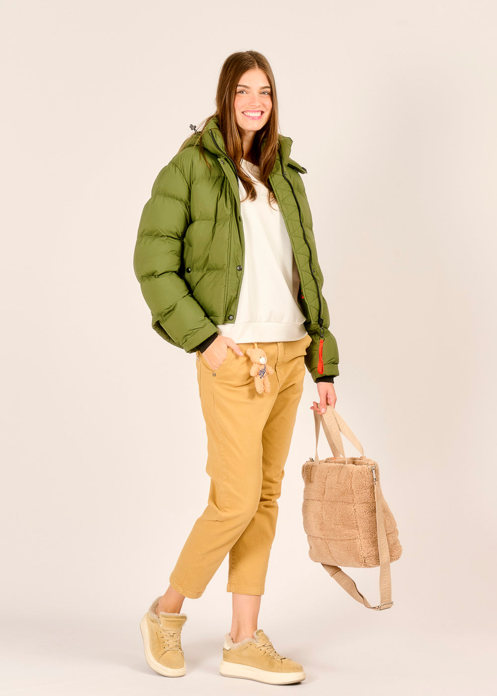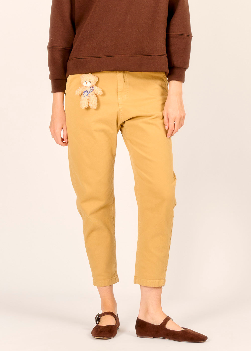 Die Chino von PLEASE in der warmen Nuance caramello vereint lässigen Chic mit einem verspielten Detail. An der Vorderseite hängt ein kleiner Teddybär, der sich im Handumdrehen abnehmen und als stylischer Taschenanhänger nutzen lässt. Der bequeme Schnitt und die hochwertige Verarbeitung machen die Hose zum perfekten Allrounder für jeden Tag. So entsteht ein Look, der Individualität und Trendbewusstsein charmant verbindet.