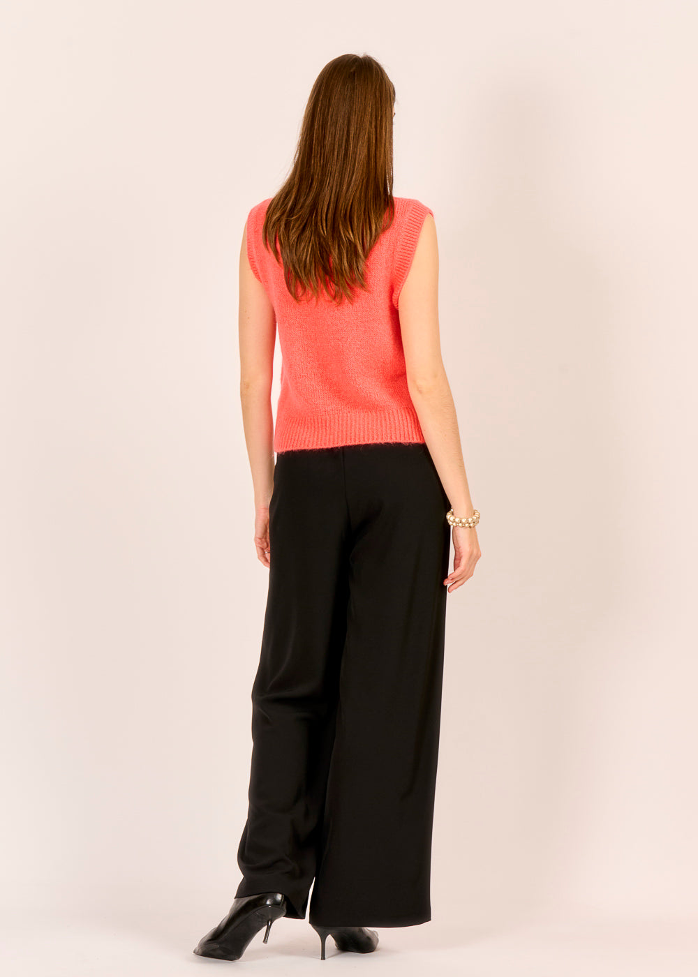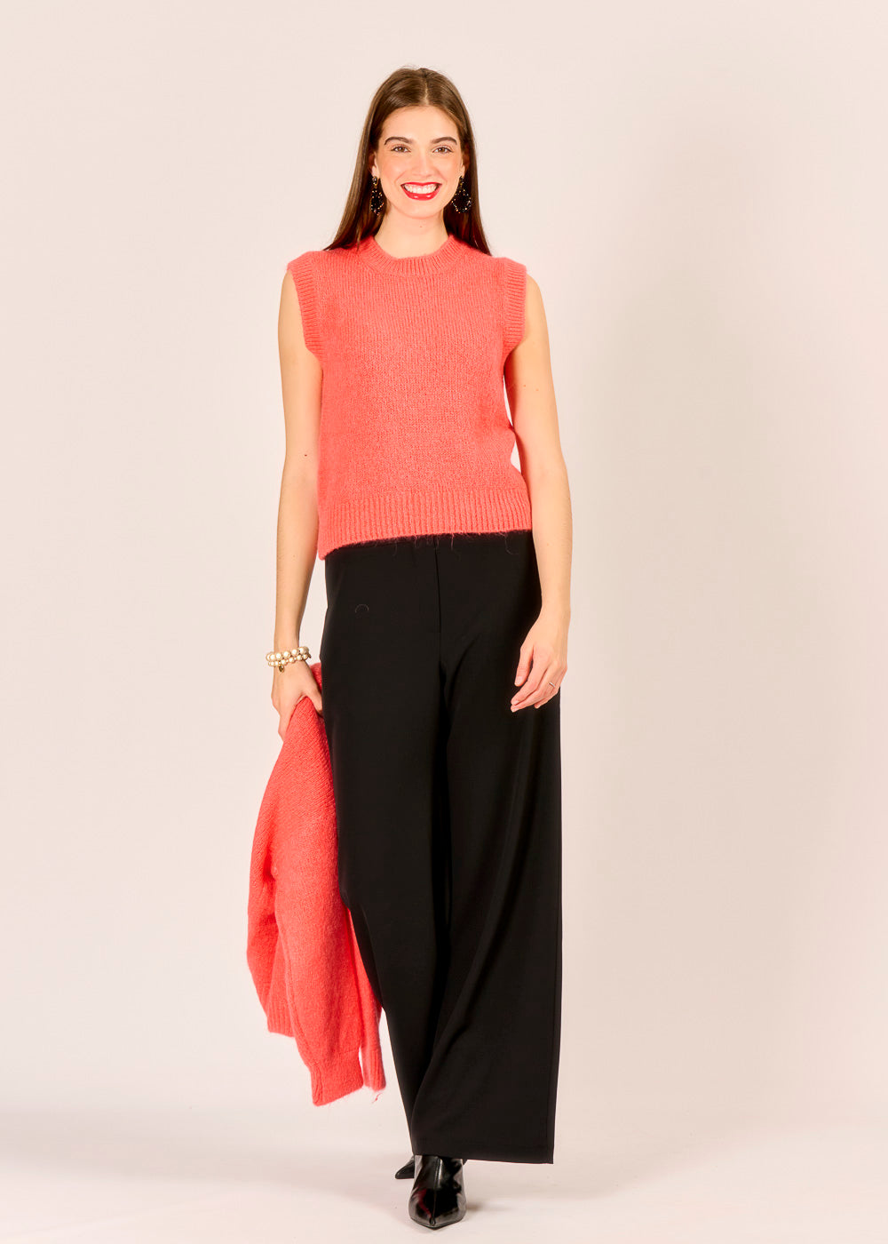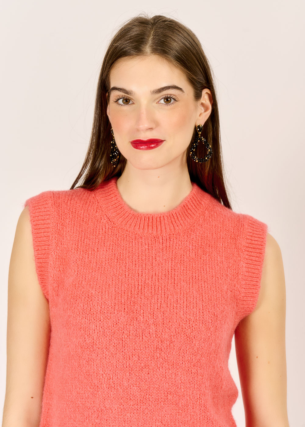 Dieser feingestrickte Top in strahlendem Corallo ist die ideale Ergänzung zur Strickjacke und setzt das leuchtende Farbspektrum perfekt fort. Sein schlichter, eleganter Schnitt macht ihn zur vielseitigen Basis für unzählige Looks. Ein modisches Key-Piece, das solo getragen an warmen Tagen brilliert oder im Twinset für einen harmonischen und stilvollen Auftritt sorgt.